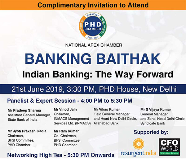 In order to discuss these aforesaid issues and Challenges, PHD Chamber of Commerce and Industry is organizing a Banking Baithak on Indian Banking: The Way Forward, 21st June 2019, at 3:30 PM, PHD House, New Delhi. This Banking Baithak aims to increase and elevate the discourse on the banking sector in India, and help develop insights to inform the continued evolution of the Indian banking sector for optimally supporting the growing credit needs of especially MSMEs who have pivotal role to play of growth and job creation in the economy.